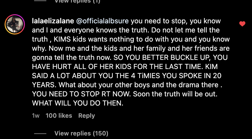 “You need to stop, you know and I and everyone knows the truth. Do not let me tell the truth, Kim’s kids want nothing to do with you, and you know why. Now me and the kids and her family and her friends are gonna tell the truth now. SO YOU BETTER BUCKLE UP; YOU HAVE HURT ALL OF HER KIDS FOR THE LAST TIME. KIM SAID A LOT ABOUT YOU THE 4 TIMES YOU SPOKE IN 20 YEARS. What about your other boys and the drama there…YOU NEED TO STOP RT NOW. Soon, the truth will be out. WHAT WILL YOU DO THEN,” Lala wrote in her heated response.