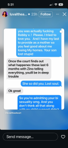 “So my BD is saying that he will not give me my child back until I go on social media and say that I am lying about the total Bobby V and benzino situation. I truly want the truth as l’ve been living this nightmare for over 10 years, you wanna play mind games I have sources that confirmed so whether it’s true or not this is the things that you have said to me so l’m not saying anything you ask me if it’s false information and I’m standing by what I said… this man is fabricating threatening to have him and my son have a sit down, so my son could say terrible things about his mother.”