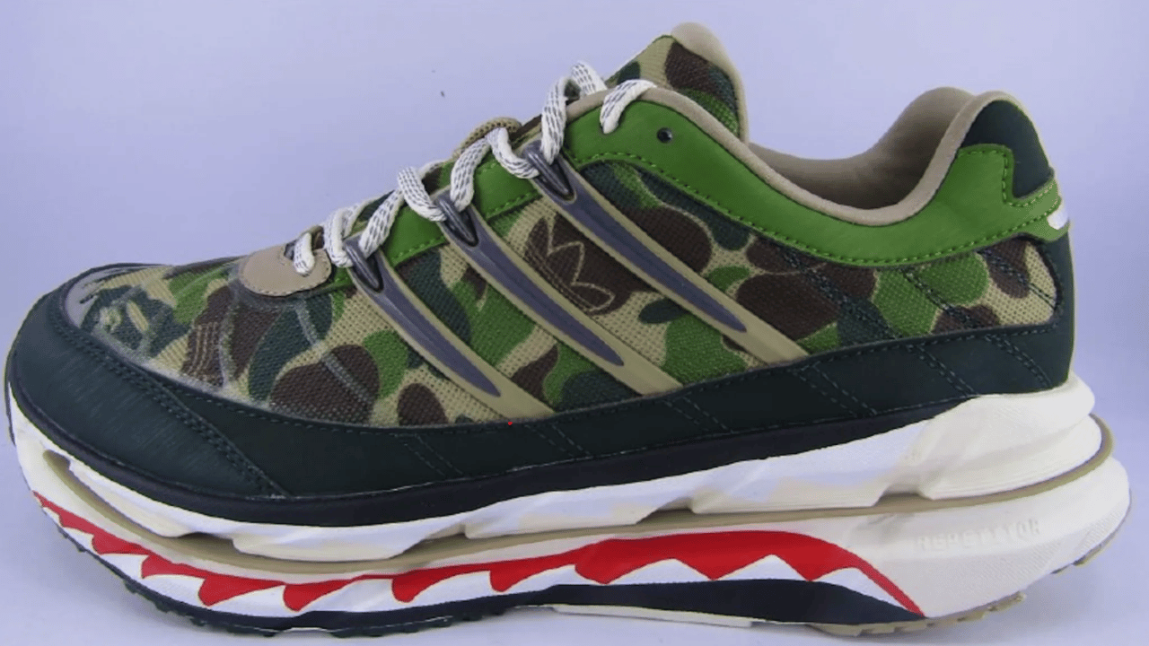 The Campus comes in a luxe croc skin–style upper, with Adidas’ Three Stripes on one side and Bape’s Sta logo on the other, finished with a sail midsole. The Samba mixes a sail and grey base with pine green hits on the dual logos and heel tab. The Adistar Hrmy stands out with Bape’s ABC camo on the upper and the brand’s iconic shark teeth graphic along the midsole. These pairs are early samples, meaning final retail versions may look different.