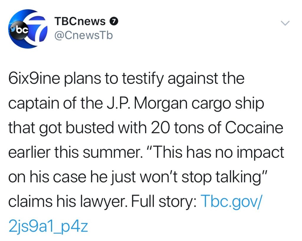 A Twitter account named CnewsTb tweeted “6ix9ine plans to testify against the captain of the J.P Morgan cargo ship that got busted with 20 tons of Cocaine earlier this summer. “This has no impact on his case he just won’t stop talking” claims his lawyer.” The joke eventually spread through social media, creating a number of hilarious gifs and memes.