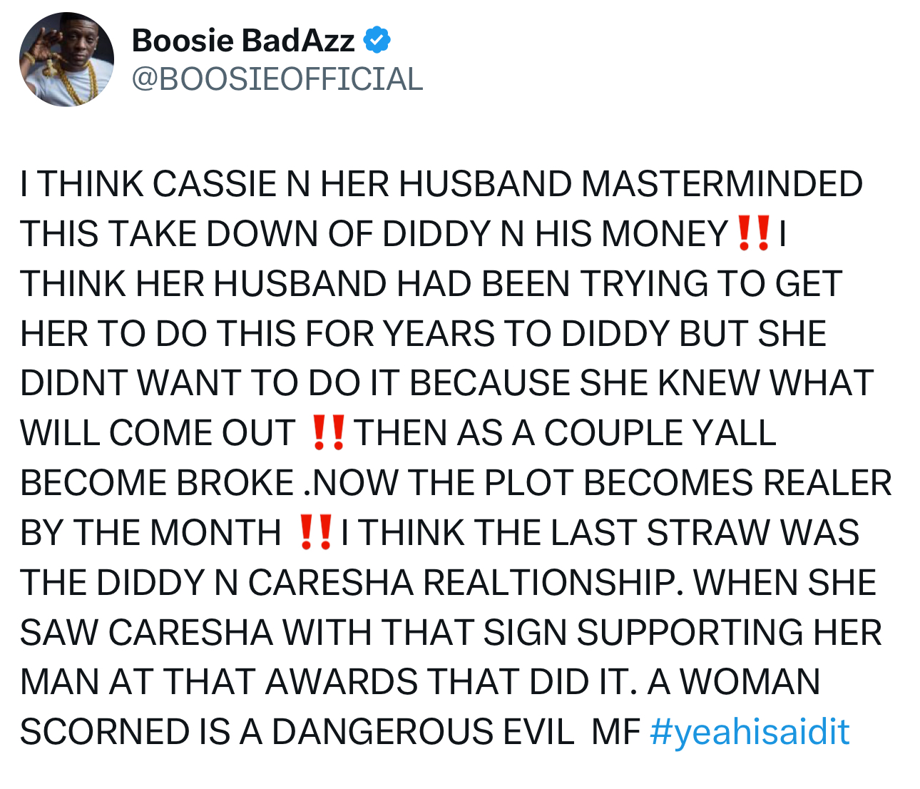 For Boosie, the situation goes deeper than just allegations. He sees it as a calculated emotional and financial retaliation. “A woman scorned is a dangerous evil,” he wrote, implying Cassie’s motivations were rooted in jealousy and resentment.