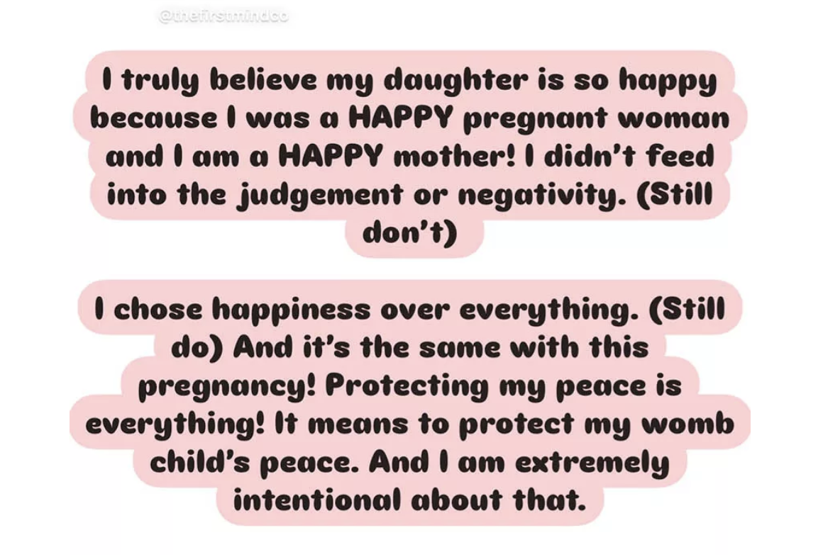 Brown expanded on her joy in an Instagram Story, saying, “I truly believe my daughter is so happy because I was a HAPPY pregnant woman and I am a HAPPY mother! I didn’t feed into the judgment or negativity. (Still don’t).” She continued, “I choose happiness over everything. (Still do)… Protecting my peace is everything! It means to protect my womb child’s peace. And I am extremely intentional about that.”