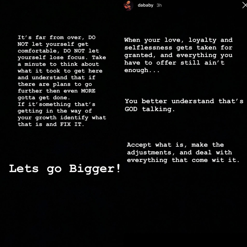 In response to the drama, Da Baby shared a few inspirational words, saying, “It’s far from over, do not let yourself get comfortable. Do not let yourself lose focus. Take a minute to think about what it took to get here and understand that if there are plans to go further then even more gotta get done. If it’s something that’s getting in the way of your growth identify what that is and fix it. LEt’s go bigger.”