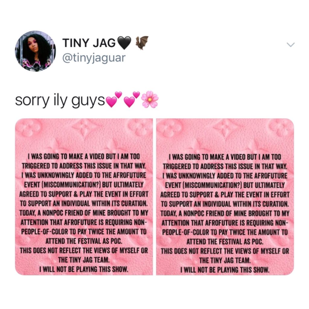 Tiny Jag tweeted, “A non-POC friend of mine brought to my attention that AfroFuture is requiring non-people-of-color to pay twice the amount to attend the festival as POC. This does not reflect the views of myself or the Tiny Jag team. I will not be playing this show. I apologize for anyone who may have been triggered or offended.”