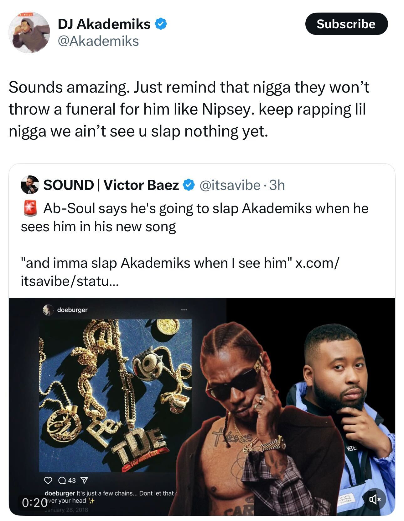 The back-and-forth between DJ Akademiks and Ab-Soul just went from lyrical to lethal-sounding—at least in tone.