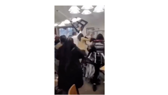 Police say over 40 people were seen clashing, throwing chairs and tables at one another in the restaurant. The three-minute and 24-second video show multiple broken glassware and scattered tables and chairs around the room. The fight appears to have taken place near one of the self-serve food areas.