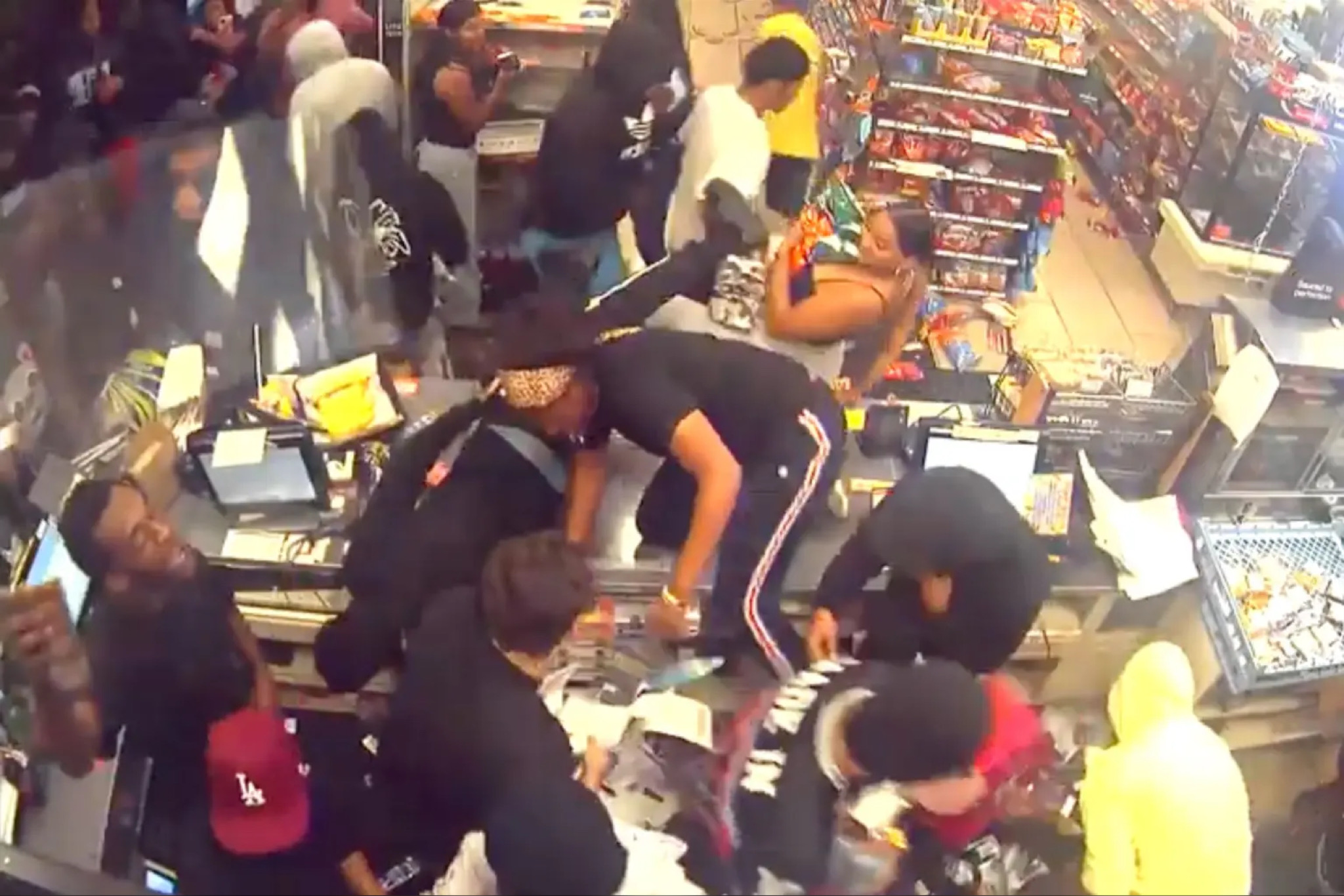 One video showed the unruly group throwing items toward another group of individuals on the other side of the counter, which appeared to have been left vacant by 7-Eleven staff.