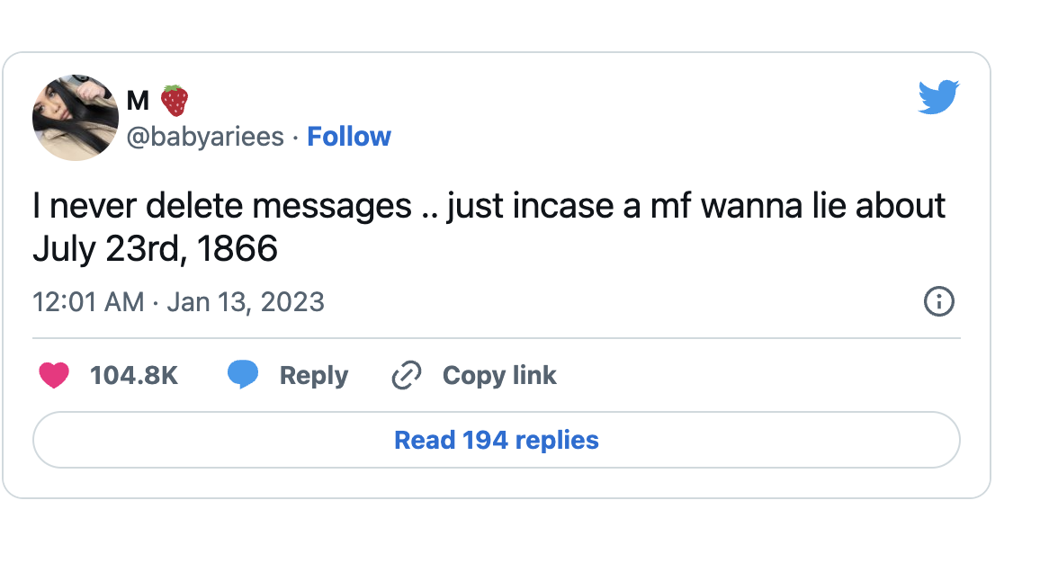 I never delete messages .. just incase a mf wanna lie about July 23rd, 1866