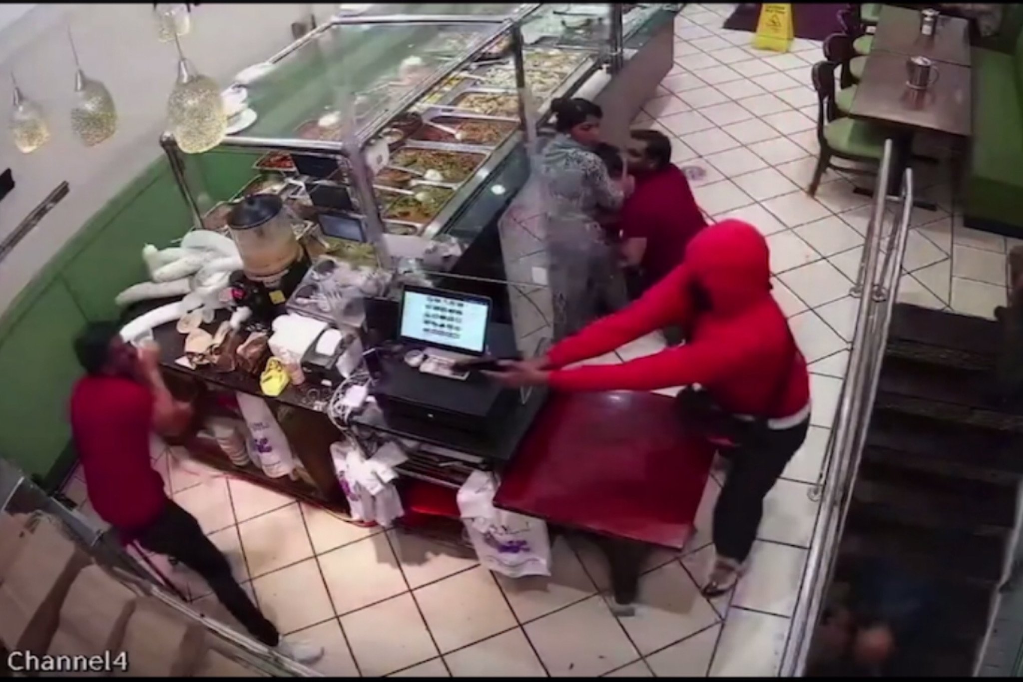 Security footage captured the moment the assailant enters Boishakhi Restaurant Saturday afternoon in Queens. The suspect was wearing a red hoodie, brandishing a handgun, and chasing after a man in a red shirt while firing shots at him.