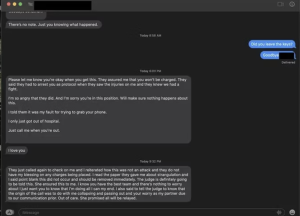 The message continues: “I know you have the best team and there’s nothing to worry about I just want you to know that I’m doing all I can my end. I also said to tell the judge to know that the origin of the call was to do with me collapsing and passing out and your worry as my partner due to our communication prior. She promised all will be relayed.”