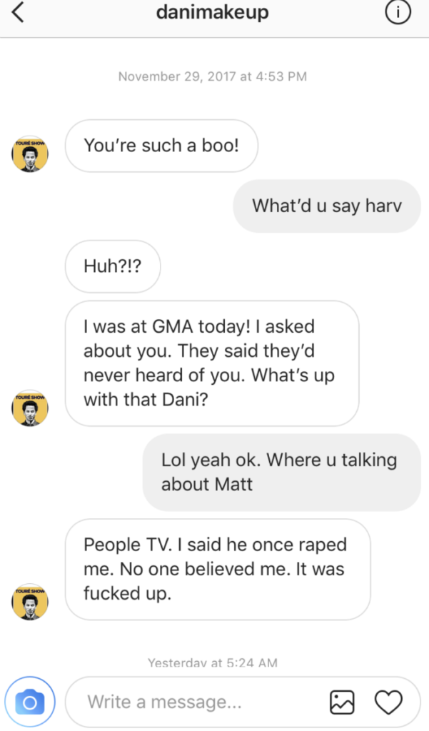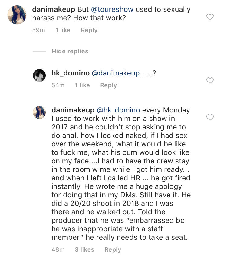 “He got fired instantly,” DaniMakeup continued. “He wrote me a huge apology for doing that in my DMs. Still have it. He did a 20/20 shoot in 2018 and I was there and he walked out. Told the producer that he was ‘embarrassed bc he was inappropriate with a staff member’ he really needs to take a seat.”