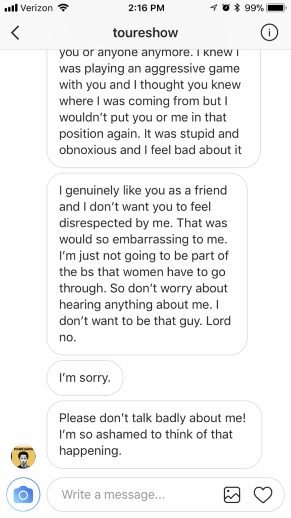 “He went on Hot97 to talk about Harvey Weinstein. I accepted his apology and was ok to move on but, you can’t be a sexual predator and go around shaming other predators,” she added, as she shared Toure’s Instagram apology, in which he claimed to have been joking.