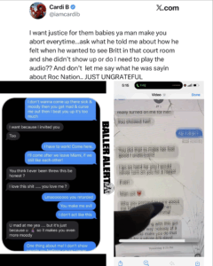 “I want justice for them babies ya man make you abort everytime… ask what he told me about how he felt when he wanted to see Britt in that court room and she didn’t show up or do I need to play the audio?? And don’t let me say what he was sayin about Roc Nation.. JUST UNGRATEFUL,” Cardi wrote.