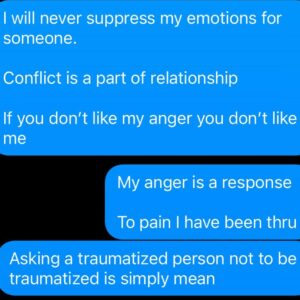 The first round of messages showed Justin taking a firm stand. “I will never suppress my emotions for someone,” he wrote. “If you don’t like my anger, you don’t like me.” He went on to explain that his emotions are connected to trauma and that being asked to tone it down feels like emotional disrespect.
