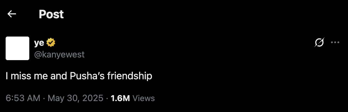 In recent days, Ye also admitted to missing Pusha T, who was formerly signed to his G.O.O.D. Music label. It’s unclear if the Chicago native has reached out to his ex-friends to make amends.
