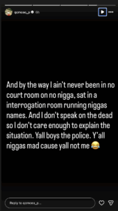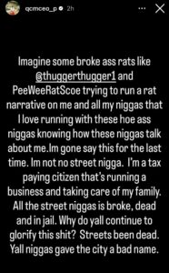 “Imagine some broke a** rats like @thuggerthugger1 and PeeWeeRatScoe trying to run a rat narrative on me and all my n***as that I love running with these h** a** n***as knowing how these n***as talk about me,” he wrote. “All the street n***as is broke, dead, and in jail. Why do ya’ll continue to glorify this s**t?”