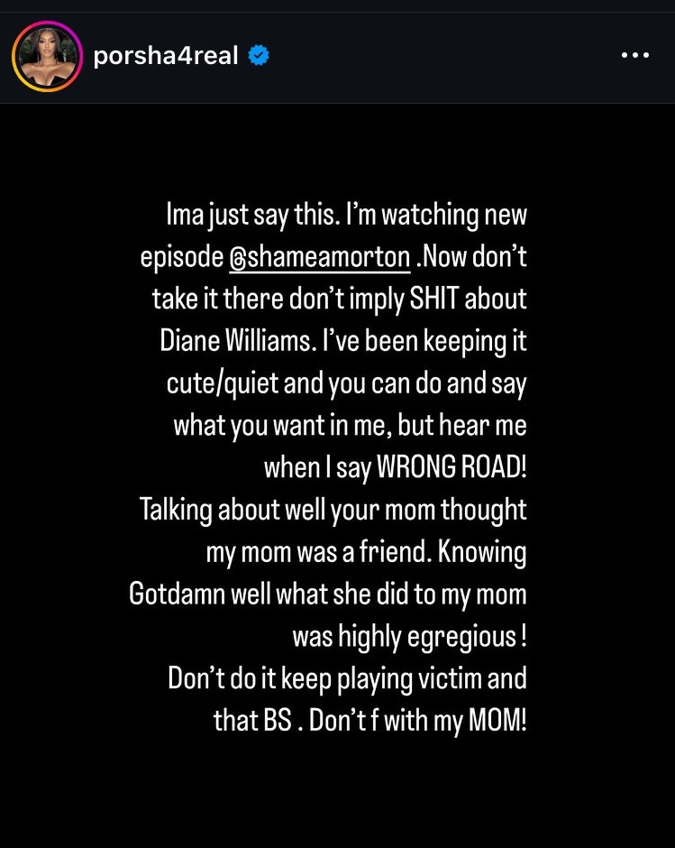 On Saturday, Porsha took to Instagram and blasted Shamea for bringing her mother Diane into their issues, an unmistakable sign that the drama is far from over. After watching the episode, it’s still unclear what Shamea said about Miss Diane that was so damaging, aside from mentioning that she used to be friends with her mother. Nevertheless, it seems we’ll see things play out on the reunion once and for all.