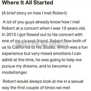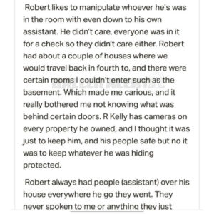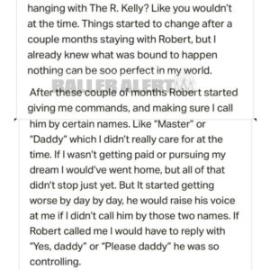 Savage shared that her relationship with Kelly changed after a few months of living with him. “Robert started giving me commands and making sure I call him by certain names like ‘Master’ or ‘Daddy’ which I didn’t really care for at the time. If I wasn’t getting paid or pursuing my dream I would’ve went home, but all of that didn’t stop just yet. But it started getting worse by day by day, he would raise his voice at me if I didn’t call him by those two names. If Robert called me I would have to reply with ‘Yes, daddy’ or ‘Please daddy’ he was so controlling.”