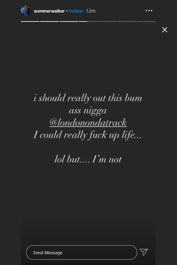 “I should really out this bum ass n*gga @londonondatrack,” she wrote on her Instagram Story. “I could really f*ck up life… lol but… I’m not.” She continued her thought in another slide. “For now. lol for now ima just take my L.” She then wrote, “A whole b*tch.”