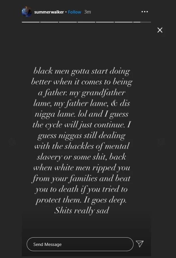 Summer then criticized black men in general, and everyone from her future baby daddy London to her own father and grandfather, saying, “Black men gotta start doing better when it comes to being a father,” she said. “My grandfather lame, my father lame, & dis n*gga lame. lol and I guess the cycle will just continue. I guess n*ggas still dealing with the shackles of mental slavery or some sh*t, back when white men ripped you from your families and beat you to death if you tried to protect them. It goes deep. Sh*ts really sad.”