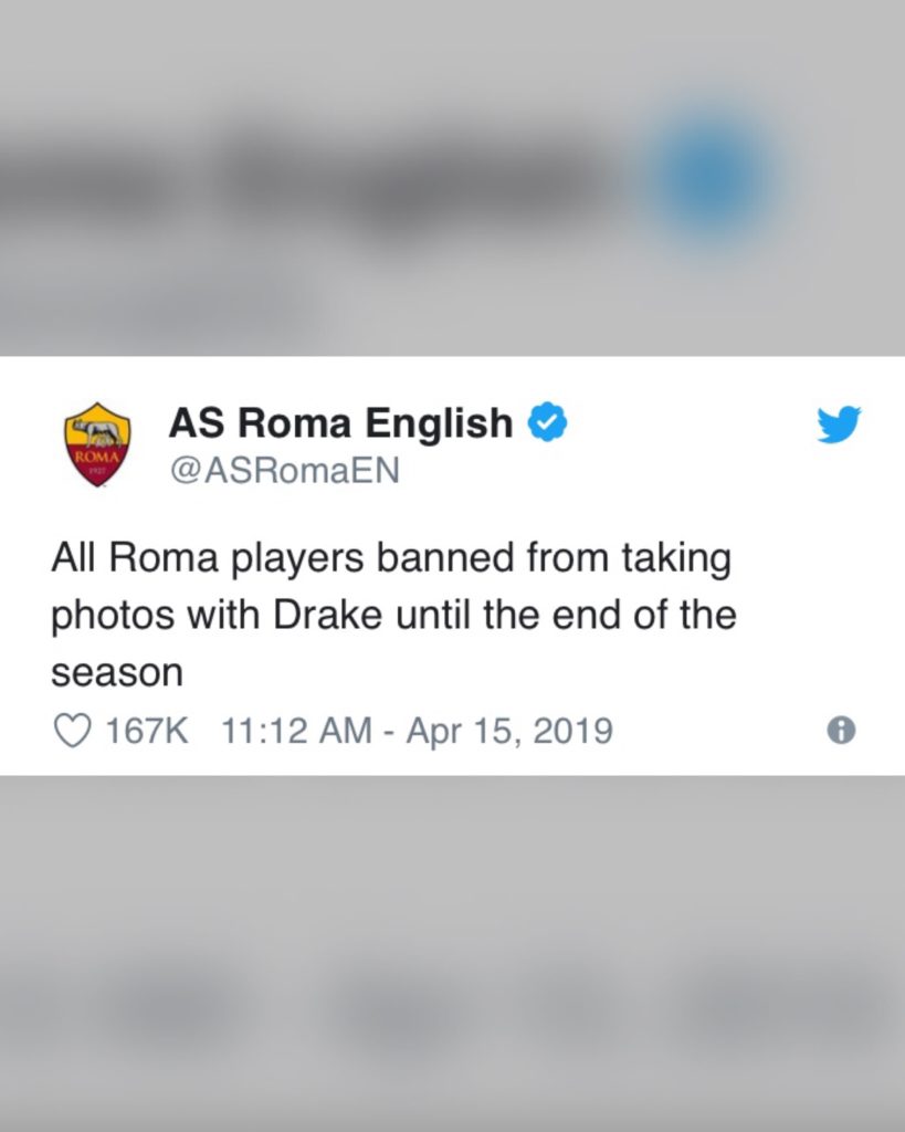 In response to PSG’s tragic loss, AS Roma, an Italian club, posted a tweet banning all team members’ photos with Drake until after their season is over. “All Roma players banned from taking photos with Drake until the end of the season,” the tweet read.
