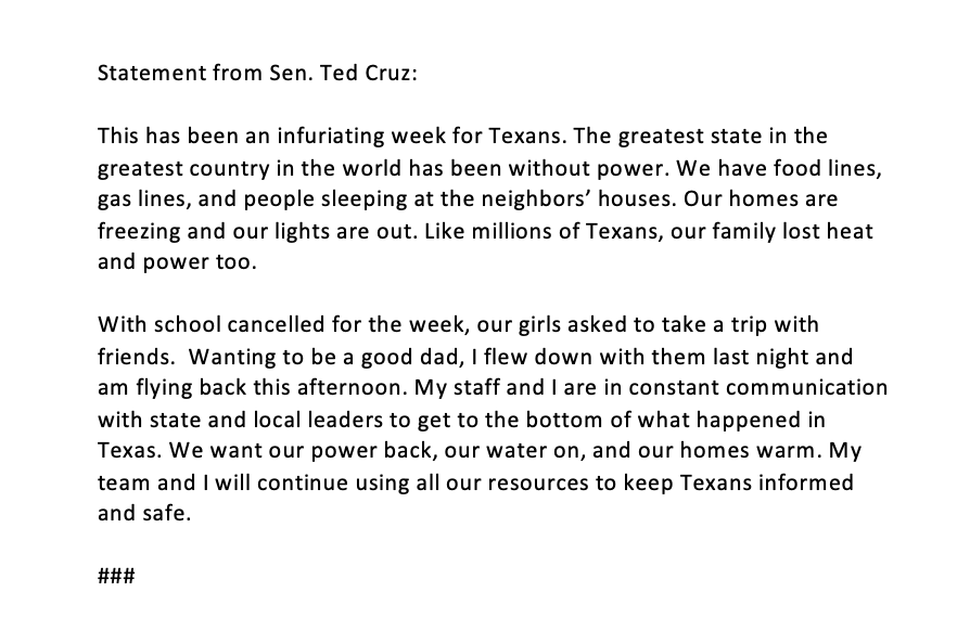 Cruz’s office released a statement a short time ago, explaining that he only flew down to Mexico with his children who asked to take a trip with their friends since school was canceled for the week due to the storm, and stated he has been in “constant communication with state and local leaders to get to the bottom of what happened in Texas.”