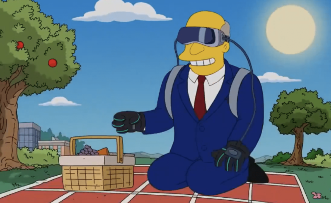 During the episode “Friends and Family,” Mr. Burns hires Marge, Bart, Lisa, and Maggie to act as his live-in virtual reality family, resembling a trial run for a headset remarkably similar to the Vision Pro.