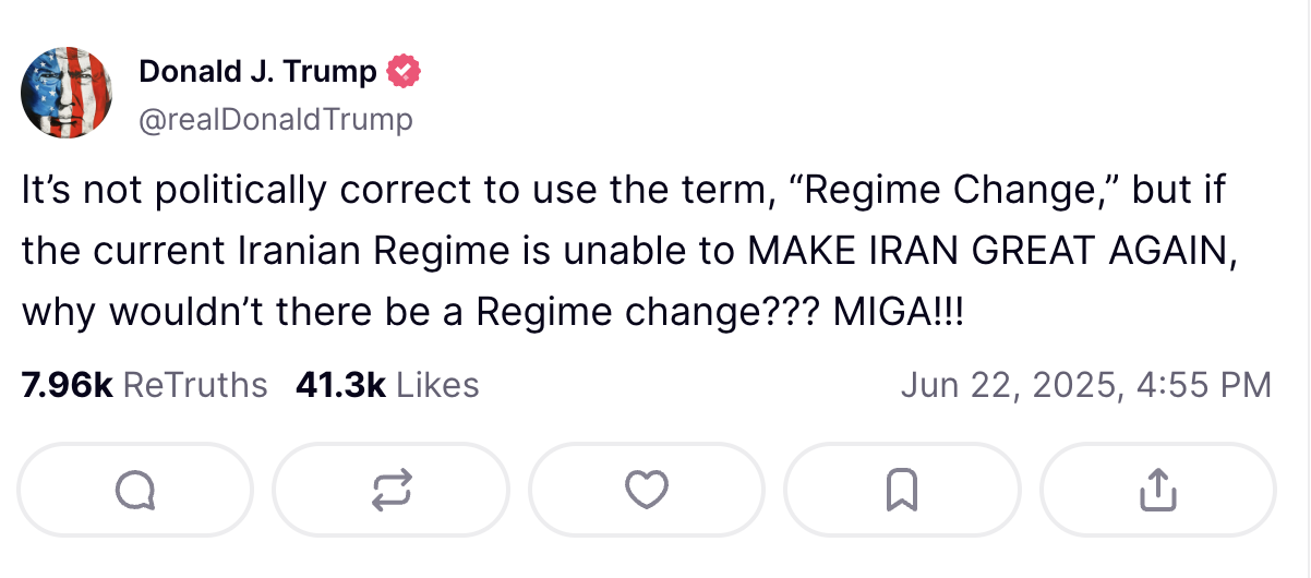 “If the current Iranian Regime is unable to MAKE IRAN GREAT AGAIN, why wouldn’t there be a Regime change???” he wrote on Truth Social. “MIGA!!!”