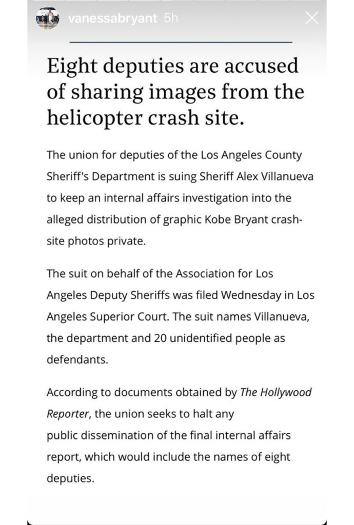 Bryant posted a series of screenshots, tweets, and articles to her Instagram story blasting Villanueva and calling out his department for graphic photos that were leaked after the tragic helicopter crash that killed her husband, Kobe Bryant, their daughter Gianna, and seven others back in January.