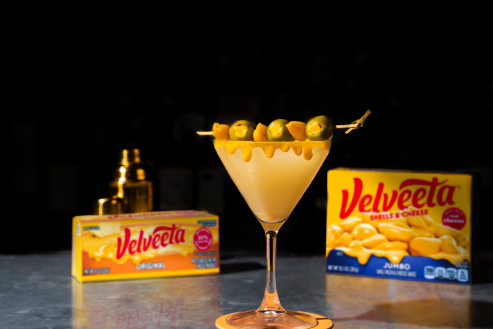 The festive beverage known as the “Veltini” is the company’s spin on the dirty martini. Veltini blends vodka, olive brine, and vermouth with the hearty flavor of the signature cheese. Velveeta-stuffed olives and jumbo Velveeta shells are the icings on top of the martini that also features a cheese drip rim.