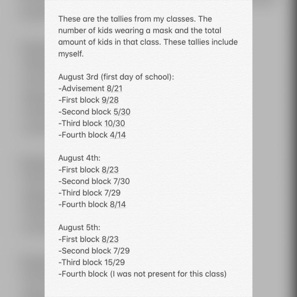 But Watters says that she took to social media because she wanted to highlight how her school “ignorantly opened back up.” “Not only did they open, but they have not been safe,” she said. “Many people are not following CDC guidelines because the county did not make these precautions mandatory.” In addition, Watters also took a tally of the students she saw wearing masks; the school decided against enforcing masks, calling it a personal choice. Watters said this is the first time she’s ever gotten in trouble at her school. “I think my punishment’s severity was excessive, but I do understand that I violated a code of conduct policy,” she said. “Wearing a mask is a personal choice, and there is no practical way to enforce a mandate to wear them,” Otott said, referring to comments about students not wearing face coverings. “What we will do is continue to strongly encourage all students and staff to wear masks.”