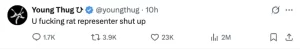 Young Thug is stirring the pot again. The Atlanta rapper posted a direct but mysterious tweet Thursday night: “U f**king rat representer shut up.”